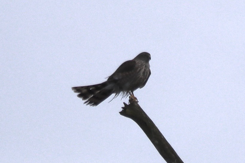 With a winter storm fast approaching—my roommates in Seattle were sending videos of snowfall at our house—the birds were quiet. After spotting a couple kestrels and a singular out-of-range Black Phoebe in the parking lot, we watched one of the kestrels get chased off by a tiny raptor, disappearing farther down the trail. I suspected it was another kestrel, or maybe even a Cooper’s Hawk, but my friend wasn’t so sure. And so we hurried after them. We were just in time to find the bird perched on a dead branch. We both struggled to get a decent shot in the mist and poor lighting, the bird nearly a silhouette against the cloudy skies. It wasn’t long before it took off again, the both of us scrambling to get a final look as it flew out of sight.