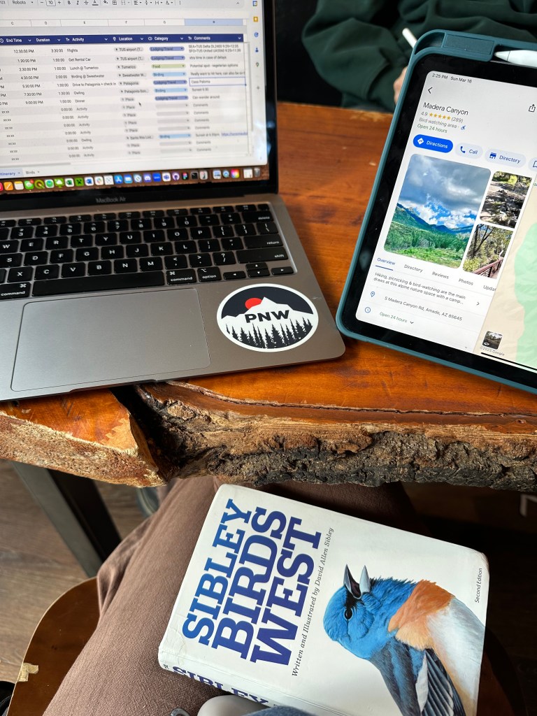 Having googled the best places in Arizona for birding, my mom found us an AirBnB in Patagonia for the first two nights and a hotel in Tucson for the last one. Our flights both landed in Tucson at around noon. Unfortunately, to squeeze Arizona into my spring break, I had to leave on Tuesday morning of my finals week. All my classes were project-based, so I placed myself in homework purgatory to finish everything nearly a week before it was due. After unceremoniously submitting my last assignment at 2pm on Saturday, I let myself relax for an afternoon before launching into Arizona prep. I had two whole days to figure out where to go and what species to be looking for.