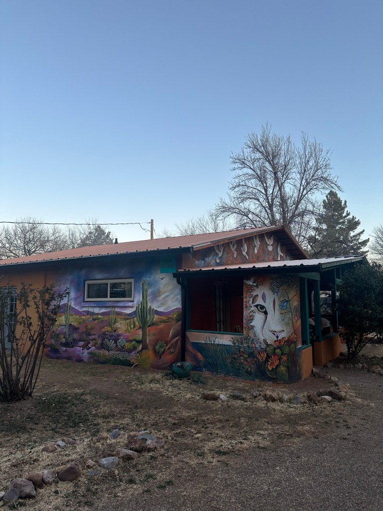 It was a cute little retreat—only a couple standalone units around a shaded gravel courtyard, with one or two rooms per building. One side of our place had a massive desert mural, and we also had an outdoor patio with a tiled table and a couple chairs. String lights hung around the courtyard, making it cozy and inviting. Inside, we had one large room and a bathroom, with a simple kitchen in the corner and a giant king bed in the middle.