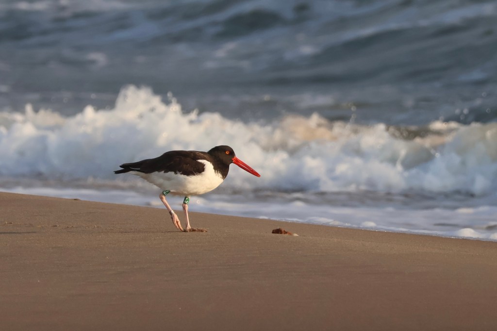 I was ready to turn around when I finally glimpsed a flock of little shorebirds running in the waves. A bunch of sanderlings, plus a bonus Black-bellied Plover and Dunlin. My eyes fixed on two larger black-and-white birds and I felt the familiar tingle of excitement in my chest I get whenever I see something new. American Oystercatchers! These funny-looking guys sported a bright orange beak and tuxedo-esque markings, with their matching orange eye giving them a look of perpetual shock. They were hilarious, and I loved them, and they were addition #350 to my life list.