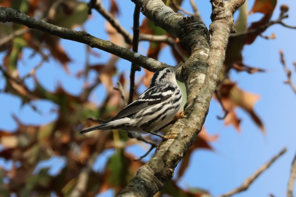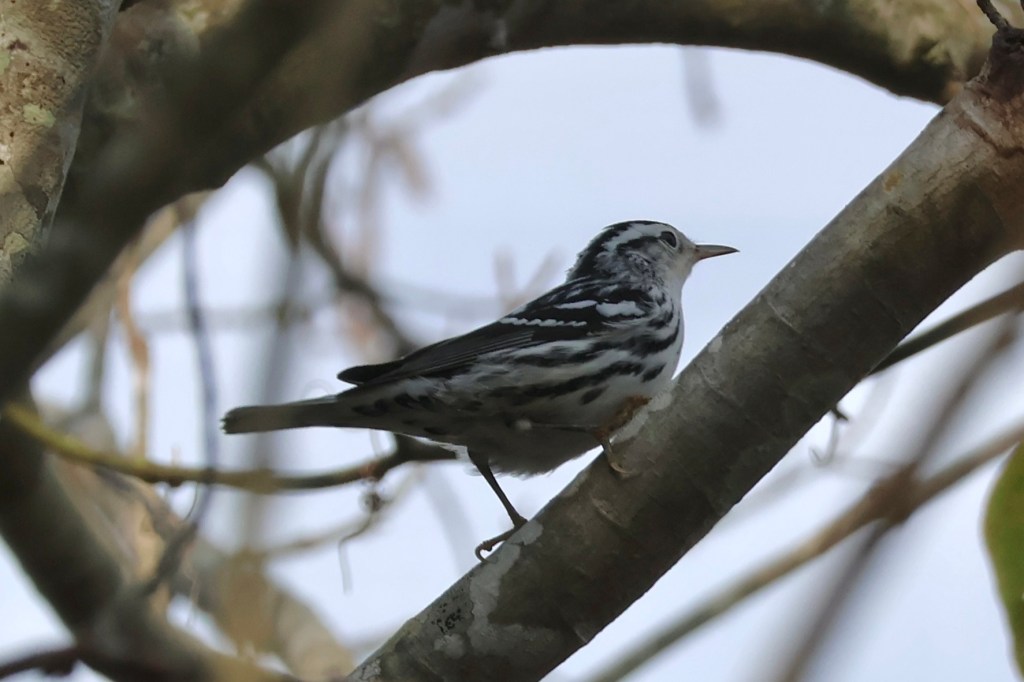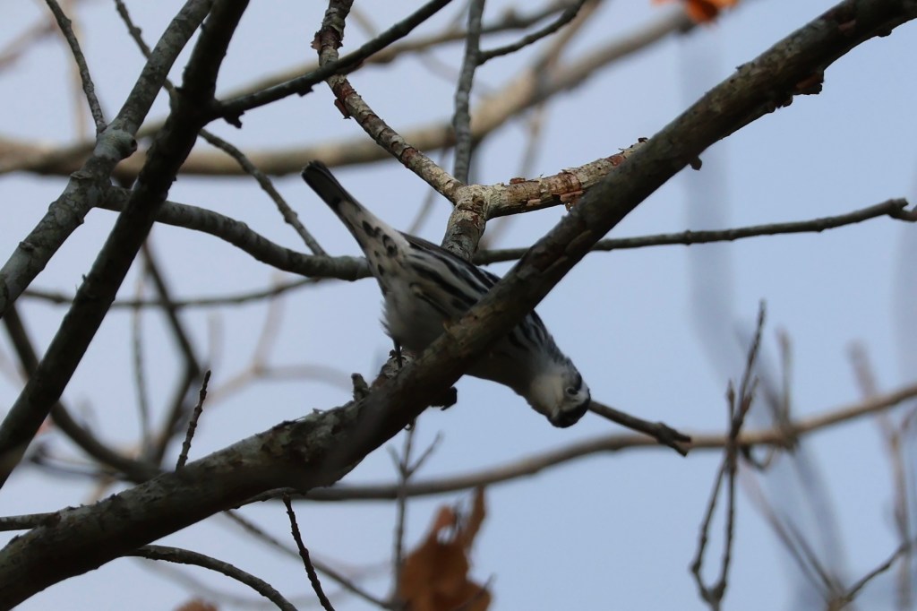 The boardwalk trail was packed with runners and bikers. One thing I still hadn’t adjusted to was the excessive friendliness of strangers. Why does everyone say good morning? How do you not get tired of saying good morning when you zoom by 15 people a minute on a bike? I don’t understand it. It took me a bit before I found my first flock of passerines: chickadees mixed with American Redstarts, a Black-and-white Warbler, and another “new world warbler sp” I couldn’t identify.