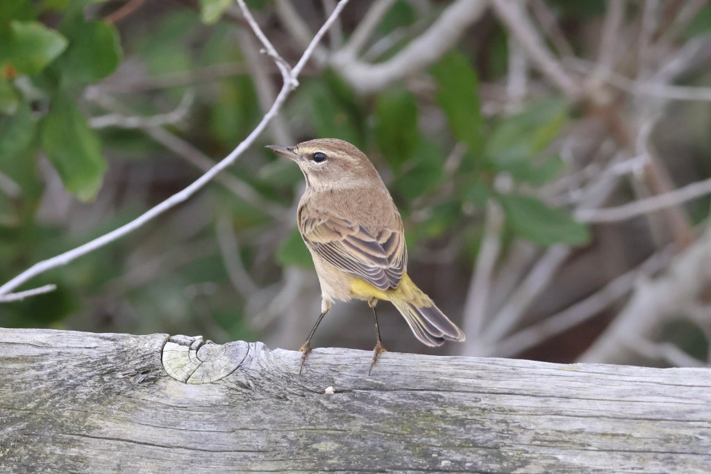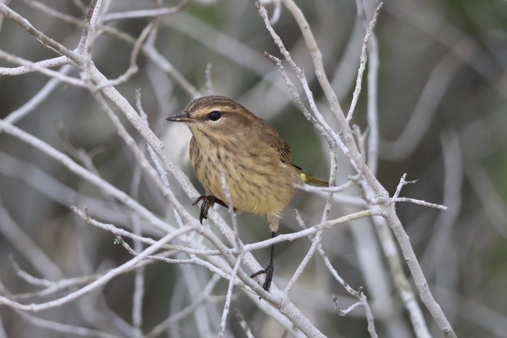After I was content with my looks at the spoonbill, I began to circle the meadows again. The morning was still pretty slow. My warbler luck never turned, minus a couple more Palm Warblers. One of them attempted to land on my baseball hat, which startled the both of us—me when a tiny creature flew directly at my face, and him when I suddenly ducked out of the way. He regarded me curiously from the bushes instead, posing for a few pictures. I returned to the hawk watch platform a few hours later to check on the spoonbill (he had left) and ask where I could find some skimmers.