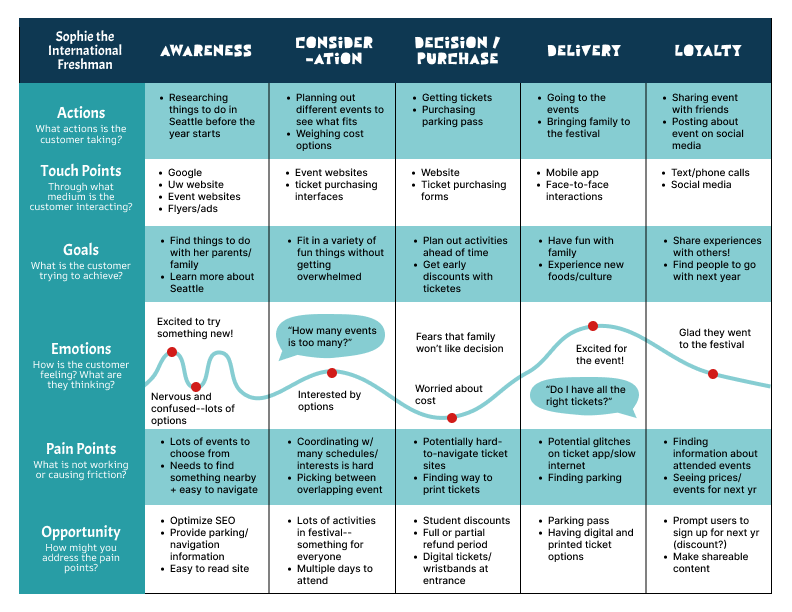 My customer journey targets my first persona (the college student). From awareness/discovery to attending the event/loyalty, I pinpoint her actions, touch points, goals, emotions, and pain points, and finally ways to improve her experience at each step.