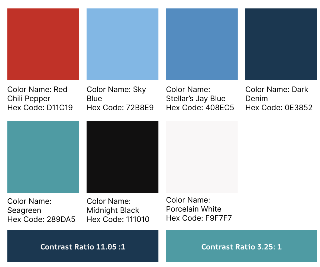 I made sure all contrast ratios met WCAG Level AA guidelines, yet throughout the class I noticed accessibility issues with red: it doesn’t stand out in the same way to red-green colorblind people as it does to everyone else, and they make up roughly 9% of the population. Although I kept it in the palette, I was mindful of that and used it very sparingly.