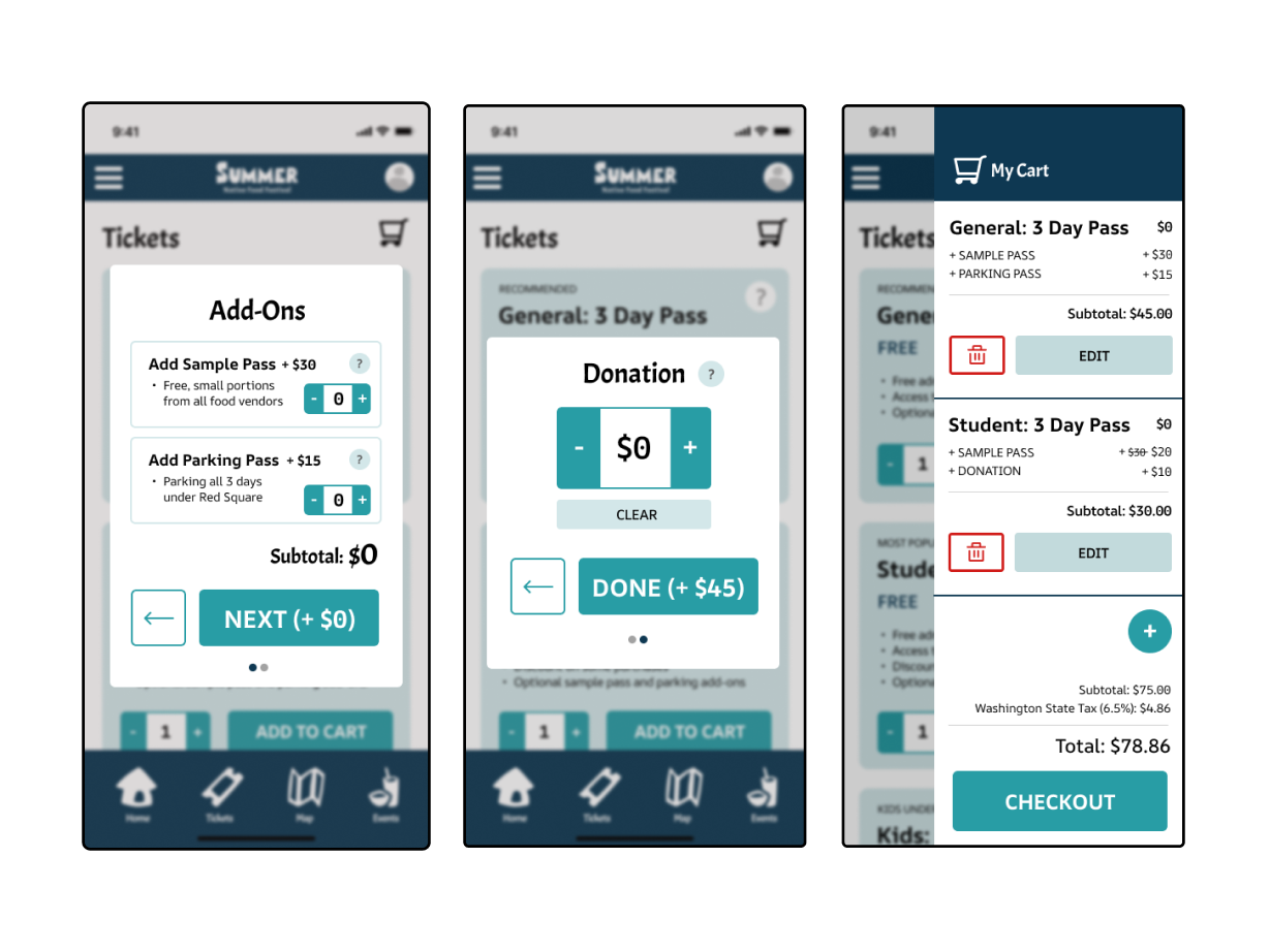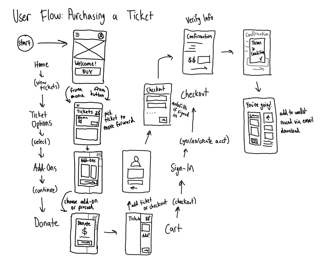 From here, I validated my takeaways from the persona creation, such as the use of parking passes. I also incorporated some new features, like a student discount to encourage student attendance, and a mobile ticket component to allow attendees to choose between a digital or physical ticket.