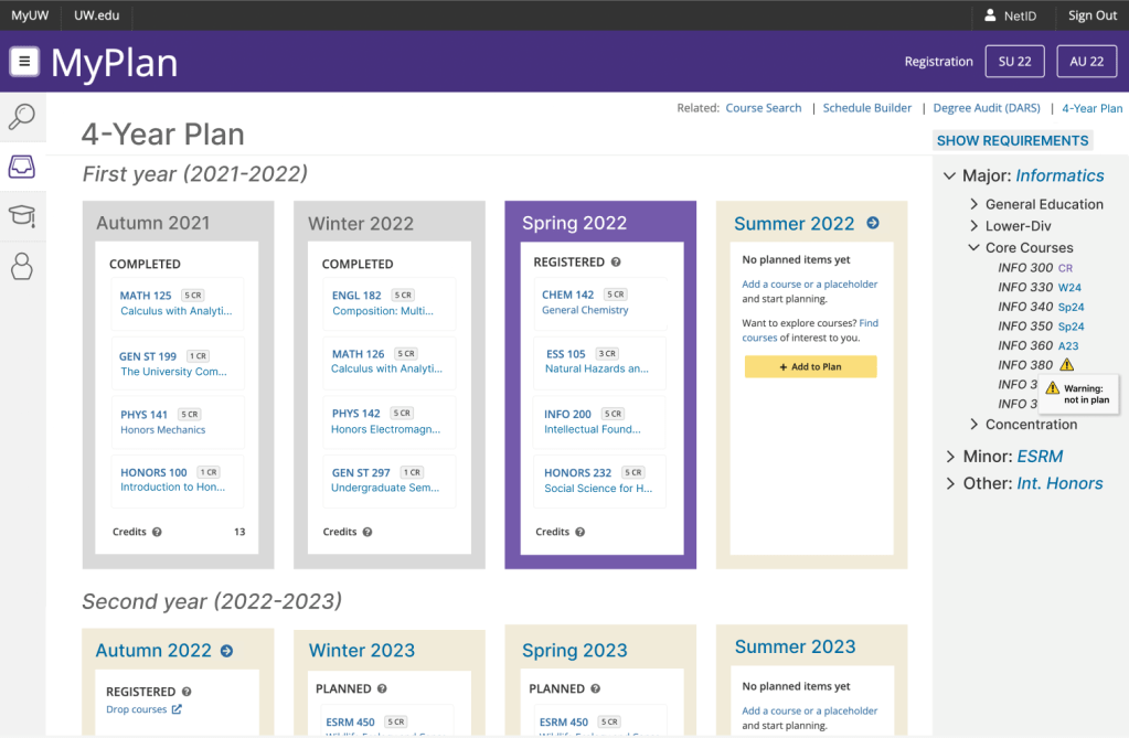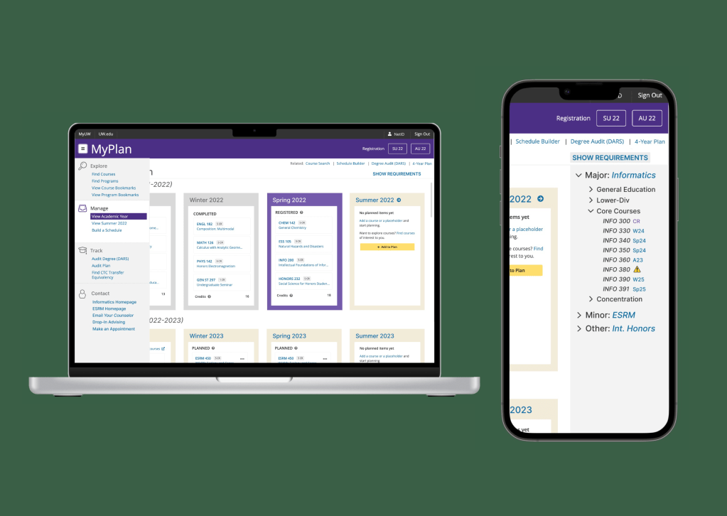 In an informatics class, we worked in pairs to redesign an existing website or app as a final project. Our chosen website, UW MyPlan, is how every UW student plans their schedule and registers for classes, or audits their degree plan to see if they’re on track to graduate.