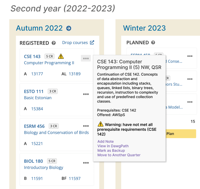 - Faulty four year plans: currently, no functions prevent students from planning classes before meeting prerequisites, or placing classes in quarters where they aren’t offered.