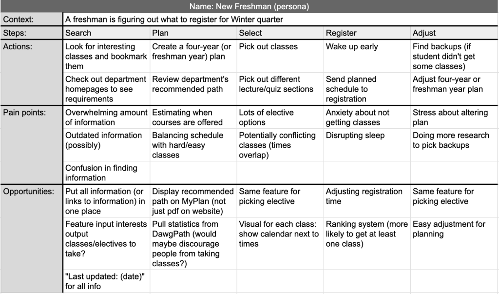 We also created a user journey for a freshman trying to register for winter courses. This allowed us to identify pain points and then opportunities for features we could implement. From this, we identified a potential new project to better the registration experience: a place where students can input their major/requirements and their interests, which then recommends an elective based on that information. However, this was deemed too complicated for the task at hand and would possibly be expanded on at a later date.