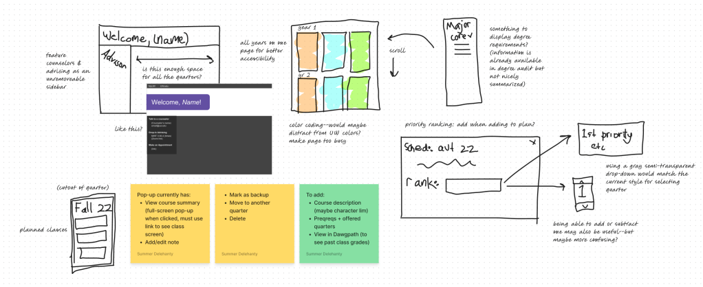 We considered how to display a four year plan and degree requirement information. We also considered how to show course descriptions more easily (which we ultimately decided to include in a pop-up) and how a student should rank a class.